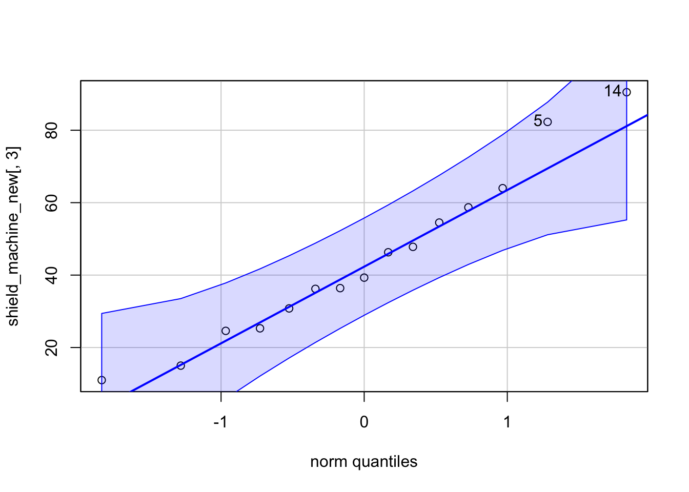 # fitted_val_log <- matrix(lm_res_log$fitted.values, 15, 3)# colnames(fitted_val_log) <- c("A", "B", "C")# qqPlot(lm_res_log$residuals, pch = 19, id = FALSE, ylab = "residuals", # main = "Normal Probability Plot for Residuals")# plot(lm_res_log$fitted.values, lm_res_log$residuals, xlab = "Fitted Value",# ylab = "Residual", main = "Versus Fits", pch = 19, col = "red")# abline(h = 0)## another way# aov_res <- aov(diameter ~ machine, data = data_sim_log)# summary(aov_res)