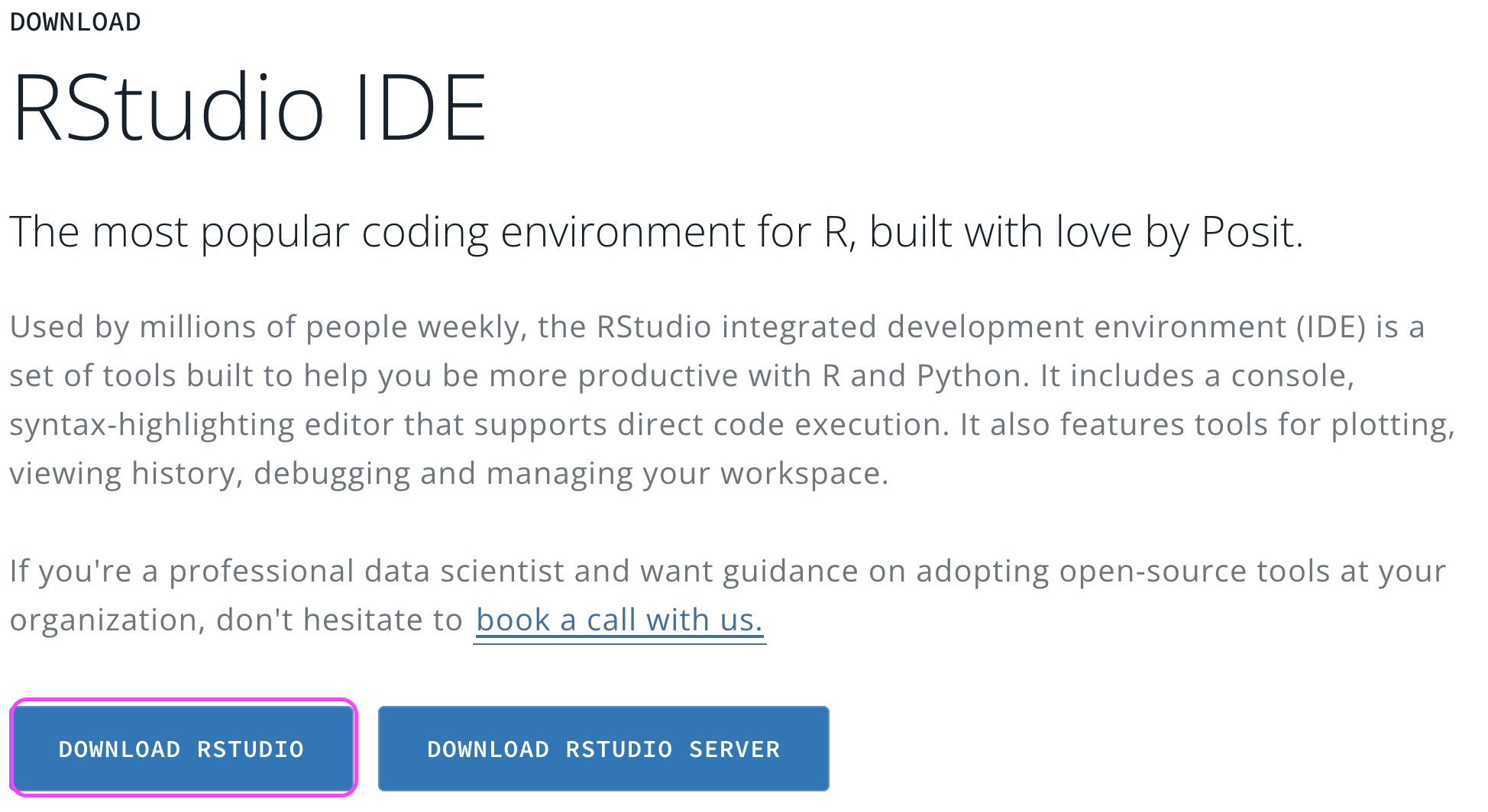 Click DOWNLOAD RSTUDIO DESKTOP FOR [Your OS version].