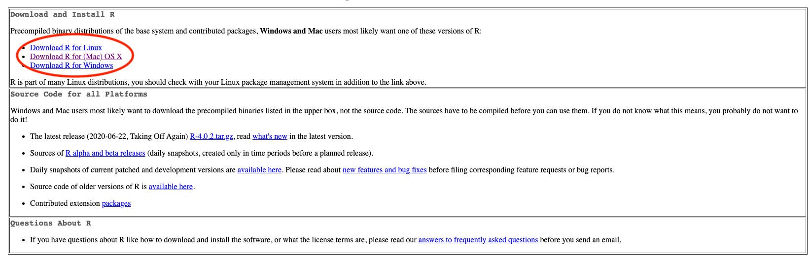 If you are a Mac user, you should see the page as below. You are recommended to download and install the latest version of R (now R-4.5.1 (Great Square Root)), if your OS version allows to do so. Otherwise, choose a previous version, R-3.6.3.