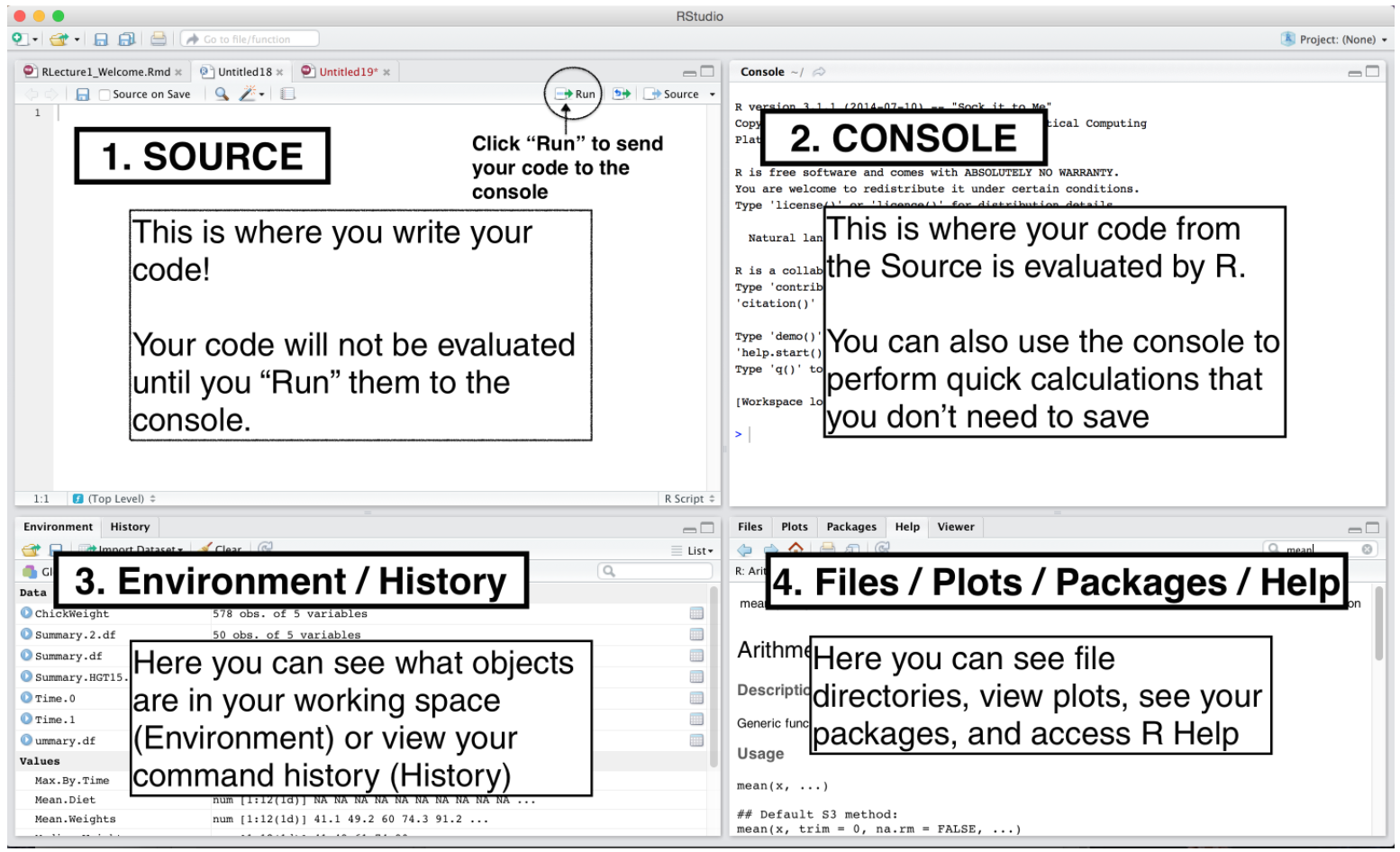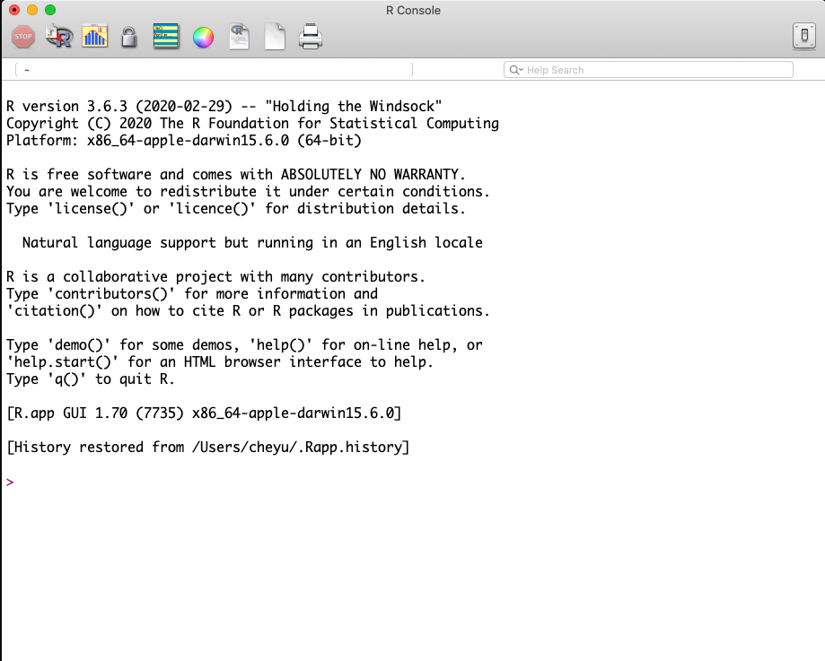 First R code: "Hello WoRld!" or 2 + 4 after > in the Console pane.