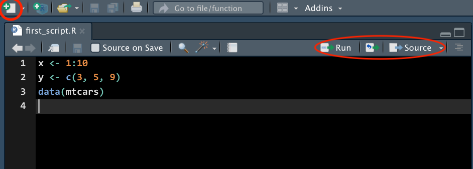 To create a R script, go to File > New > R Script, or click the green-plus icon on the topleft corner, and select R Script.