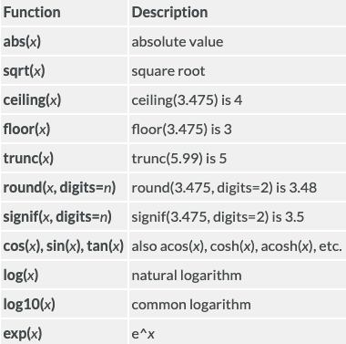 log(x) # Variables can also be used in any built-in functions[1] 2.397895