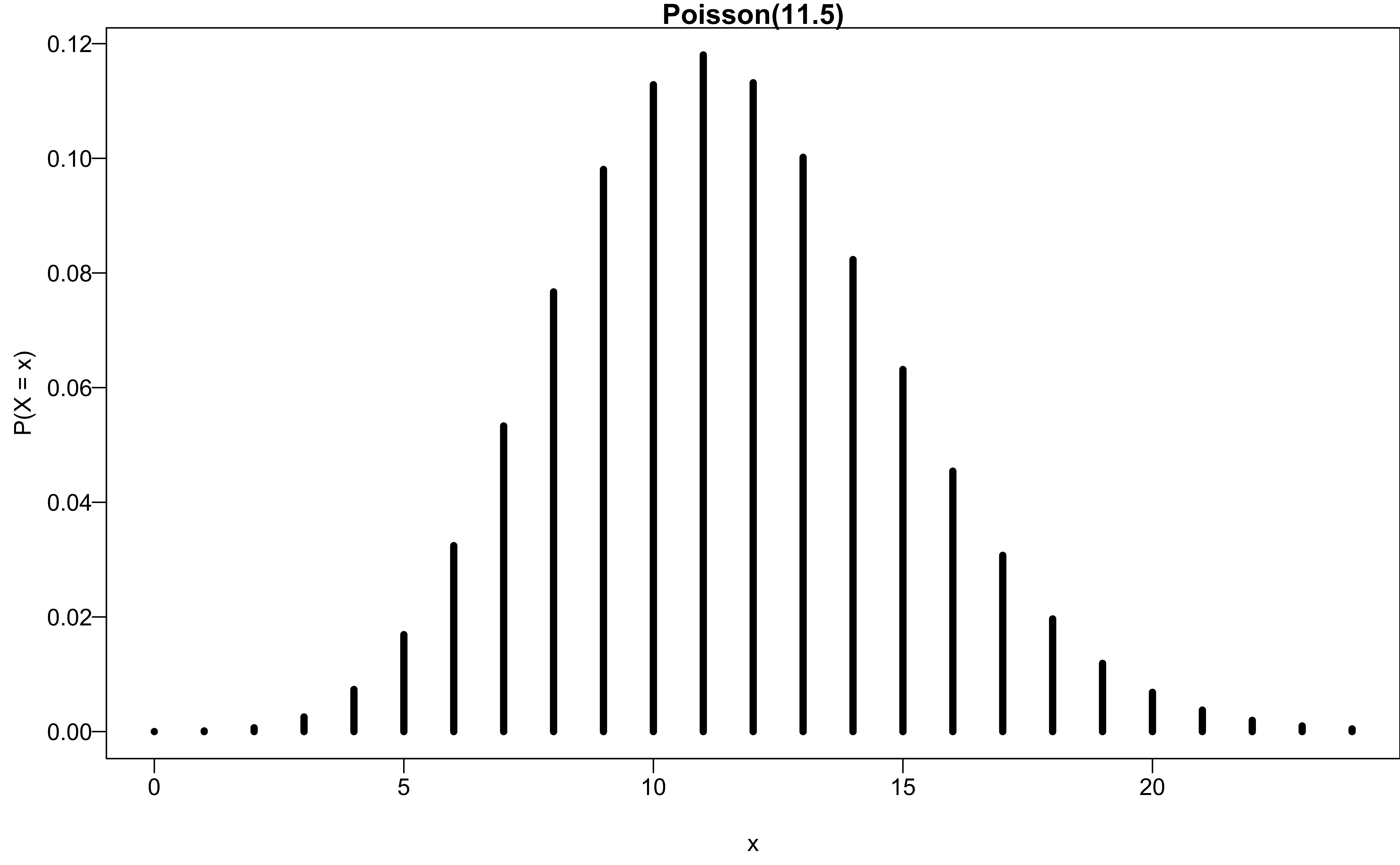 Last year there were 4200 births at the University of Wisconsin Hospital. Assume \(X\) be the number of births in a given day at the center, and \(X \sim Poisson(\lambda)\). Find