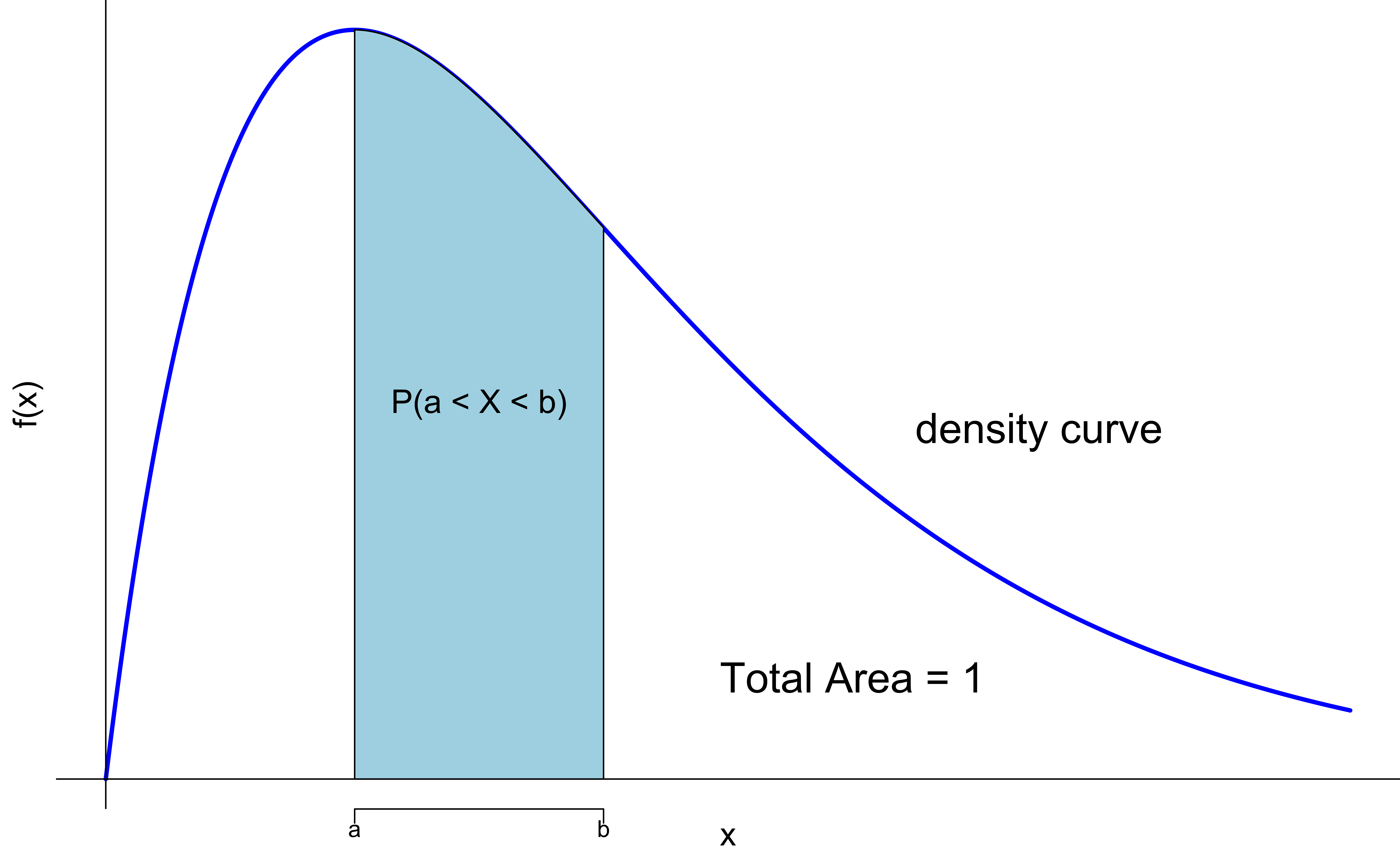 \(P(a < X < b) = \int_{a}^b f(x) dx\): The area under the density curve between \(a\) and \(b\).