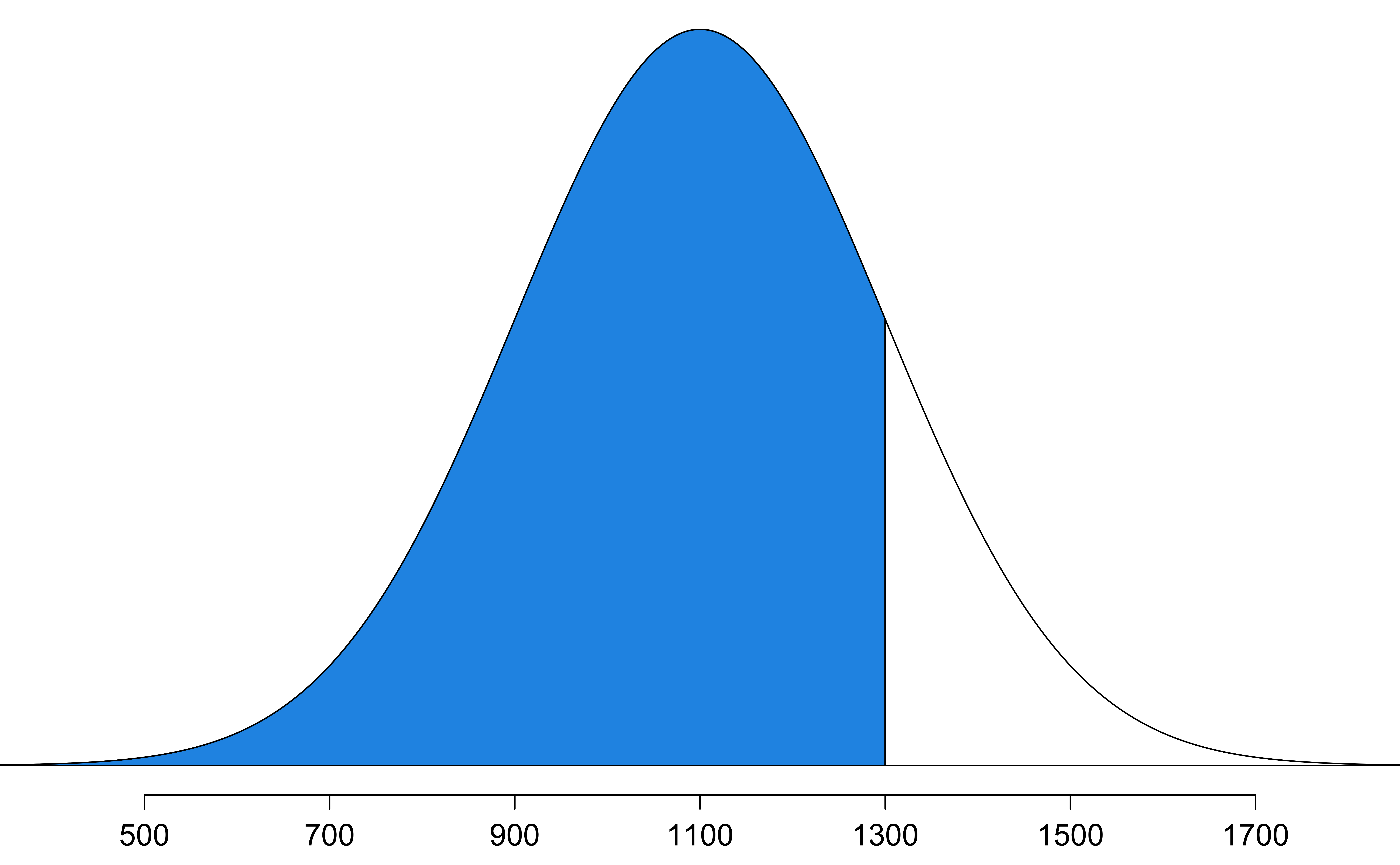 Need \(P(X < 1300 \mid \mu = 1100, \sigma = 200)\) or \(P(Z < 1 \mid \mu = 0, \sigma = 1)\).