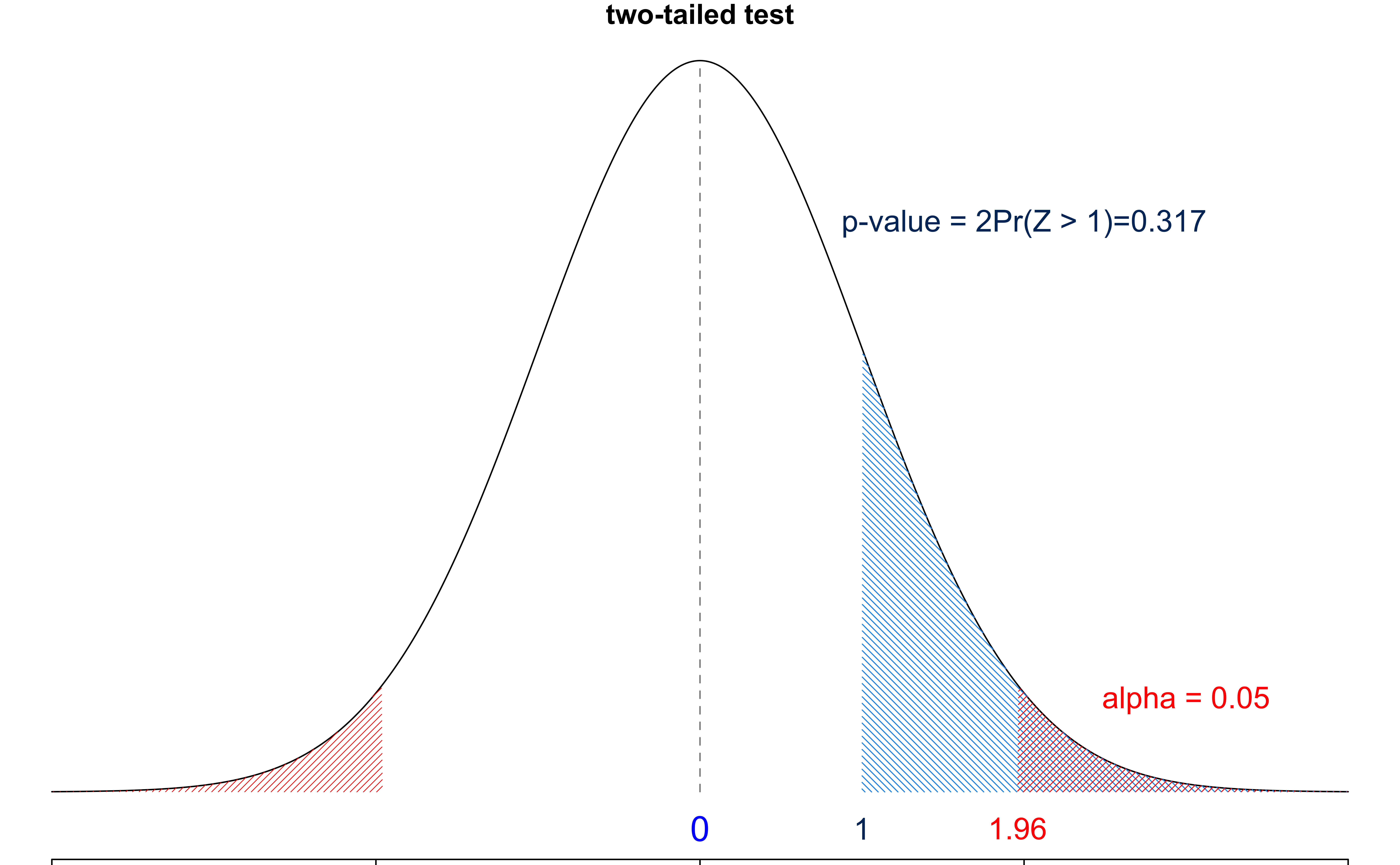 (p_val <- 2 * pnorm(z_test, lower.tail = FALSE)) [1] 0.3173
