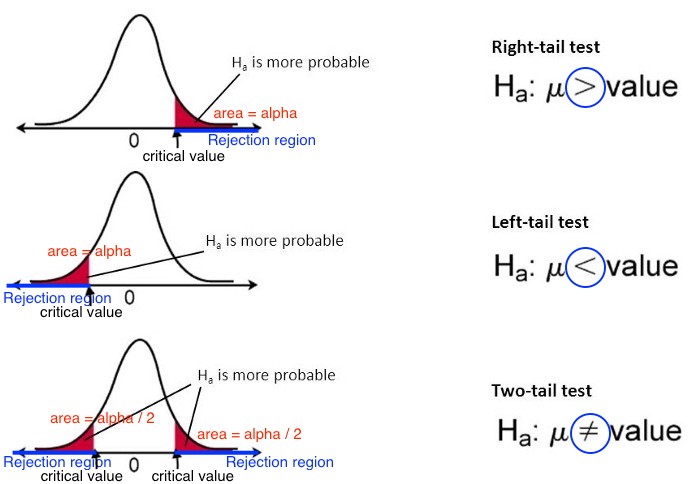 | Condition | Right-tailed \((H_1: \mu > \mu_0)\) | Left-tailed \((H_1: \mu < \mu_0)\) | Two-tailed \((H_1: \mu \ne \mu_0)\) |