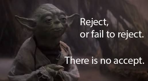 not in the rejection region, we do not or fail to reject \(H_0\).