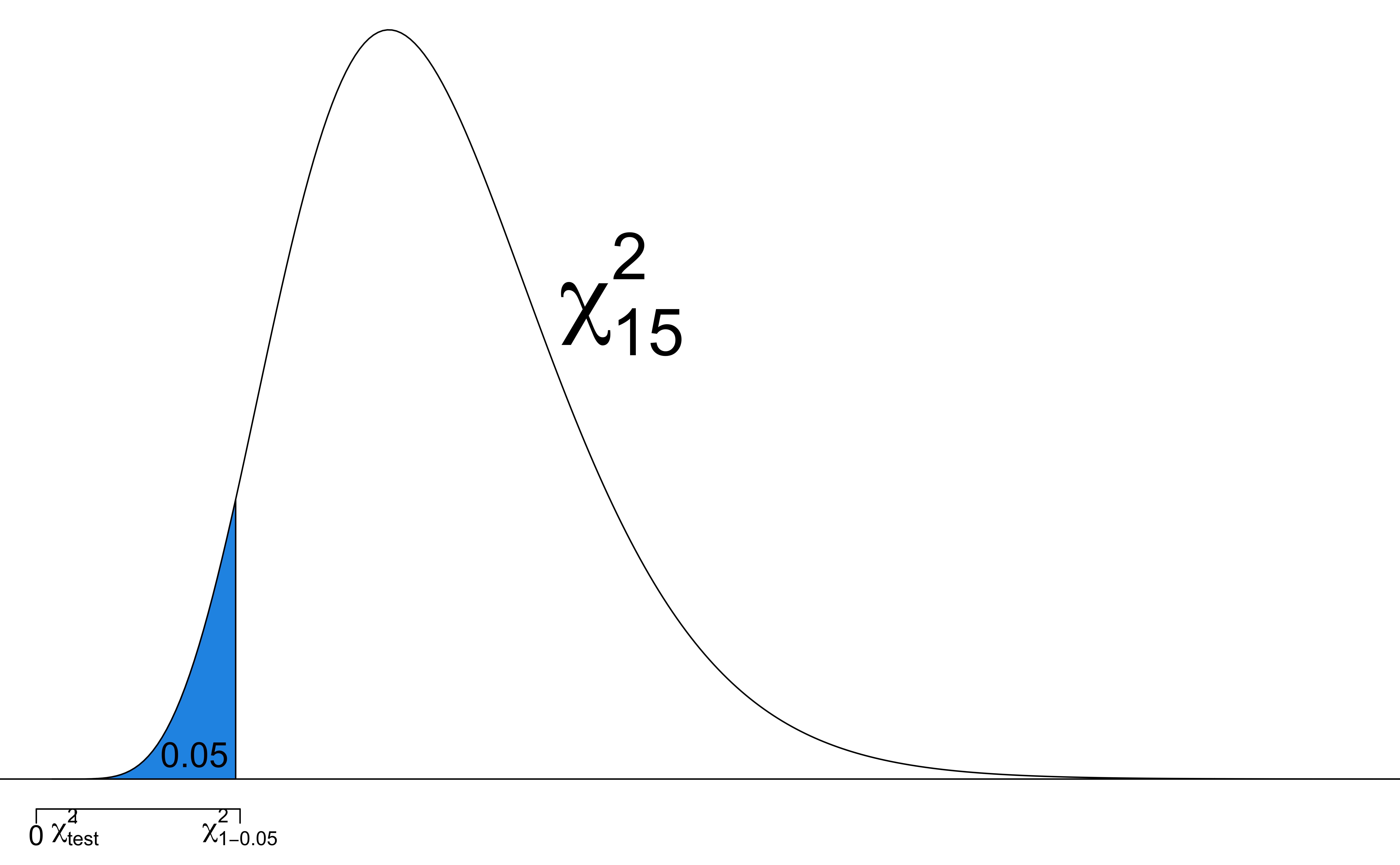 Step 3: Under \(H_0\), \(\chi_{test}^2 = \frac{(n-1)s^2}{\sigma_0^2} = \frac{(16-1)(3.4)}{7.5^2} = 0.91\), a statistic drawn from \(\chi^2_{n-1}\).