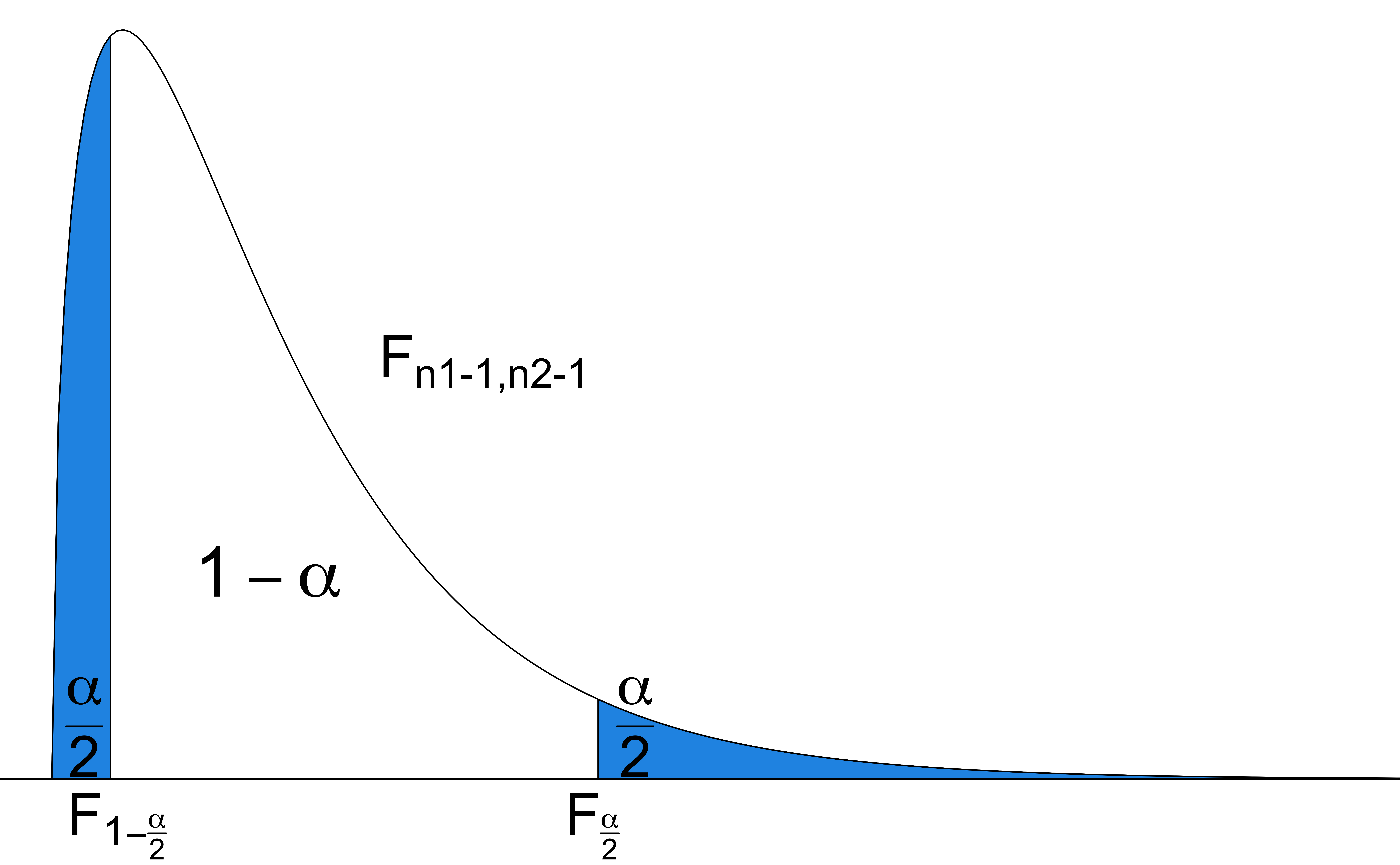\[\small F_{test} = \frac{s_1^2/s_2^2}{\sigma_1^2/\sigma_2^2} = \frac{s_1^2}{s_2^2} \sim F_{n_1-1, \, n_2-1}\]