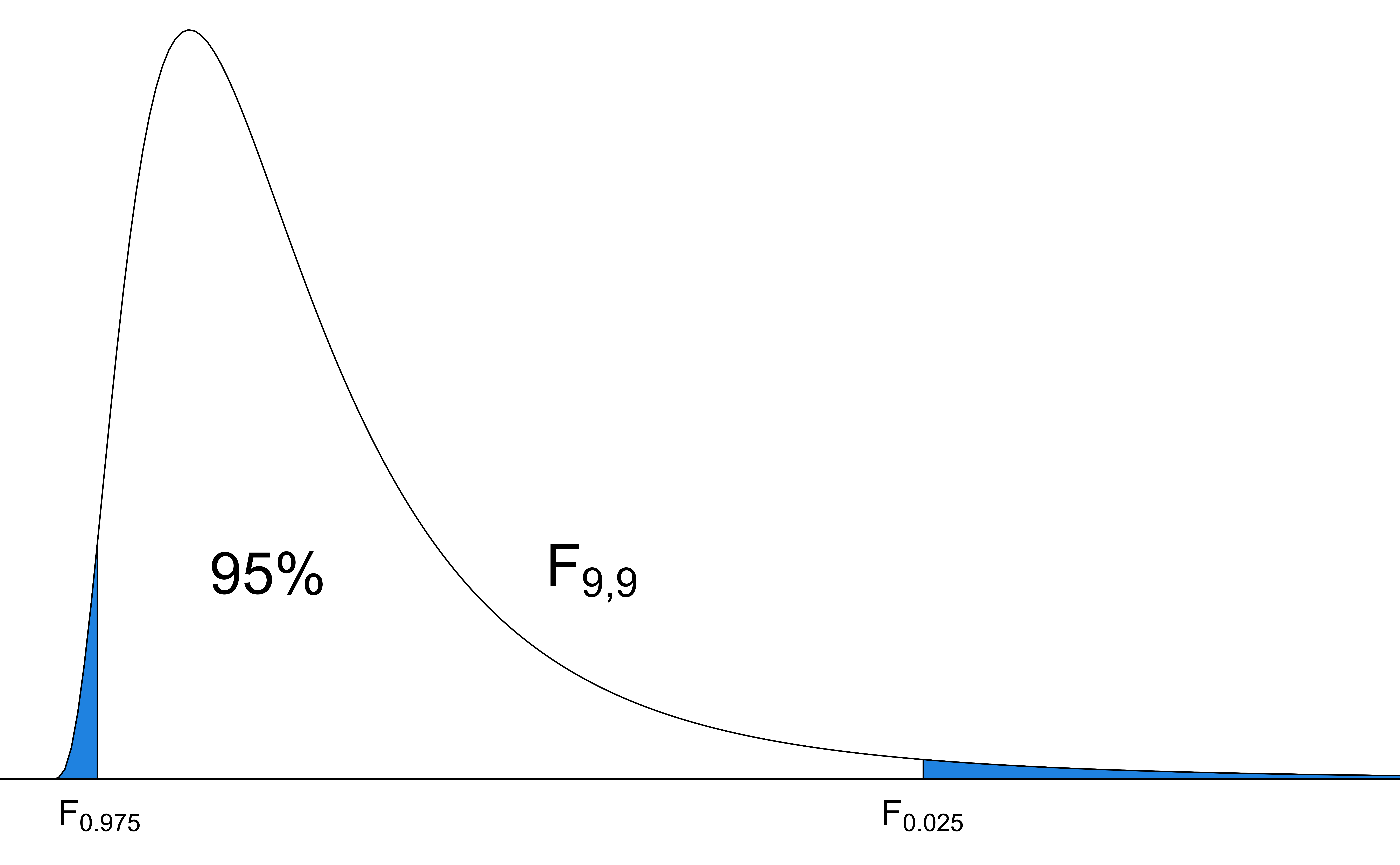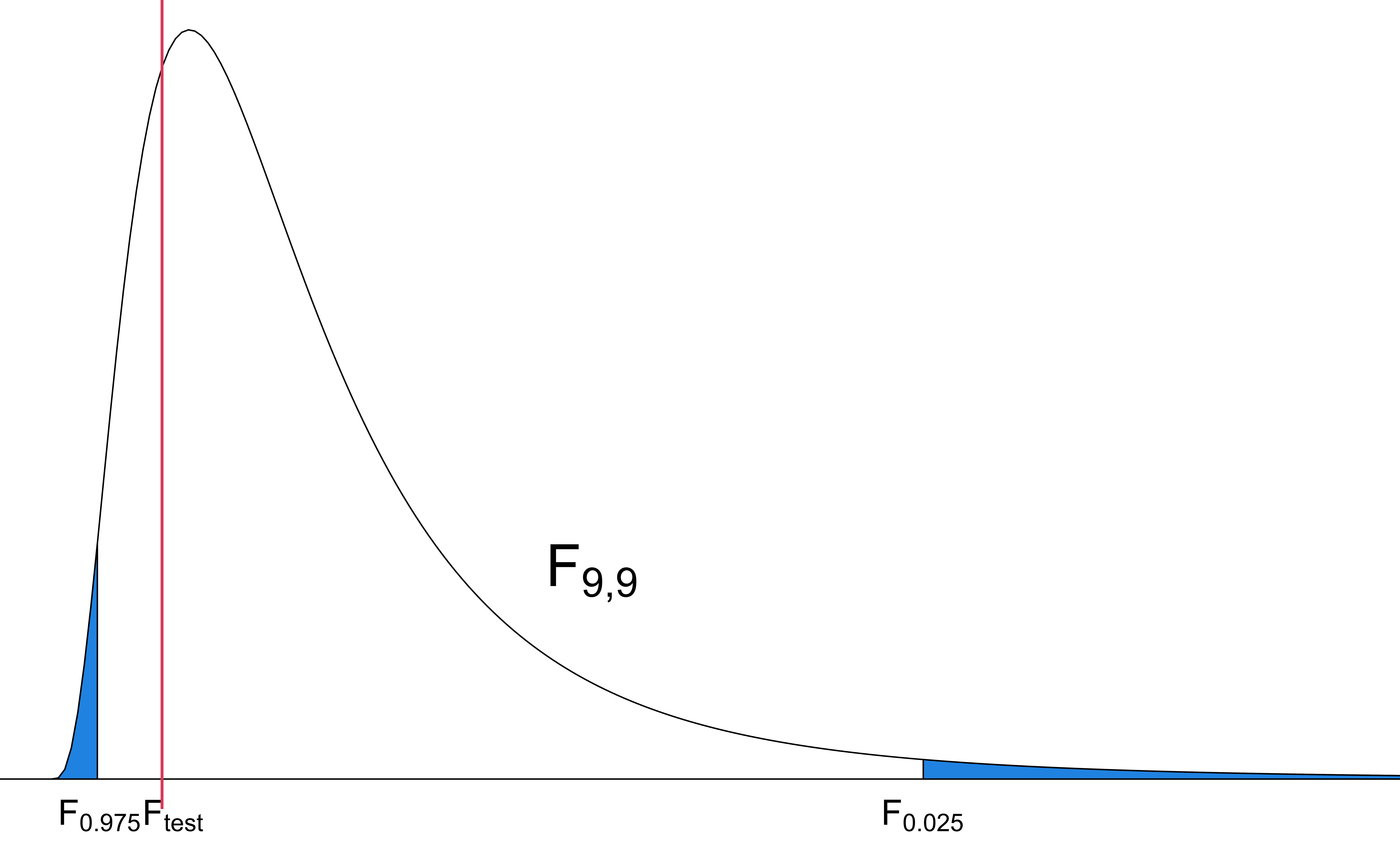 Step 4-c: Two-tailed test. The critical value is \(F_{0.05/2, \, 10-1, \, 10-1} = 4.03\) or \(F_{1-0.05/2, \, 10-1, \, 10-1} = 0.25\).