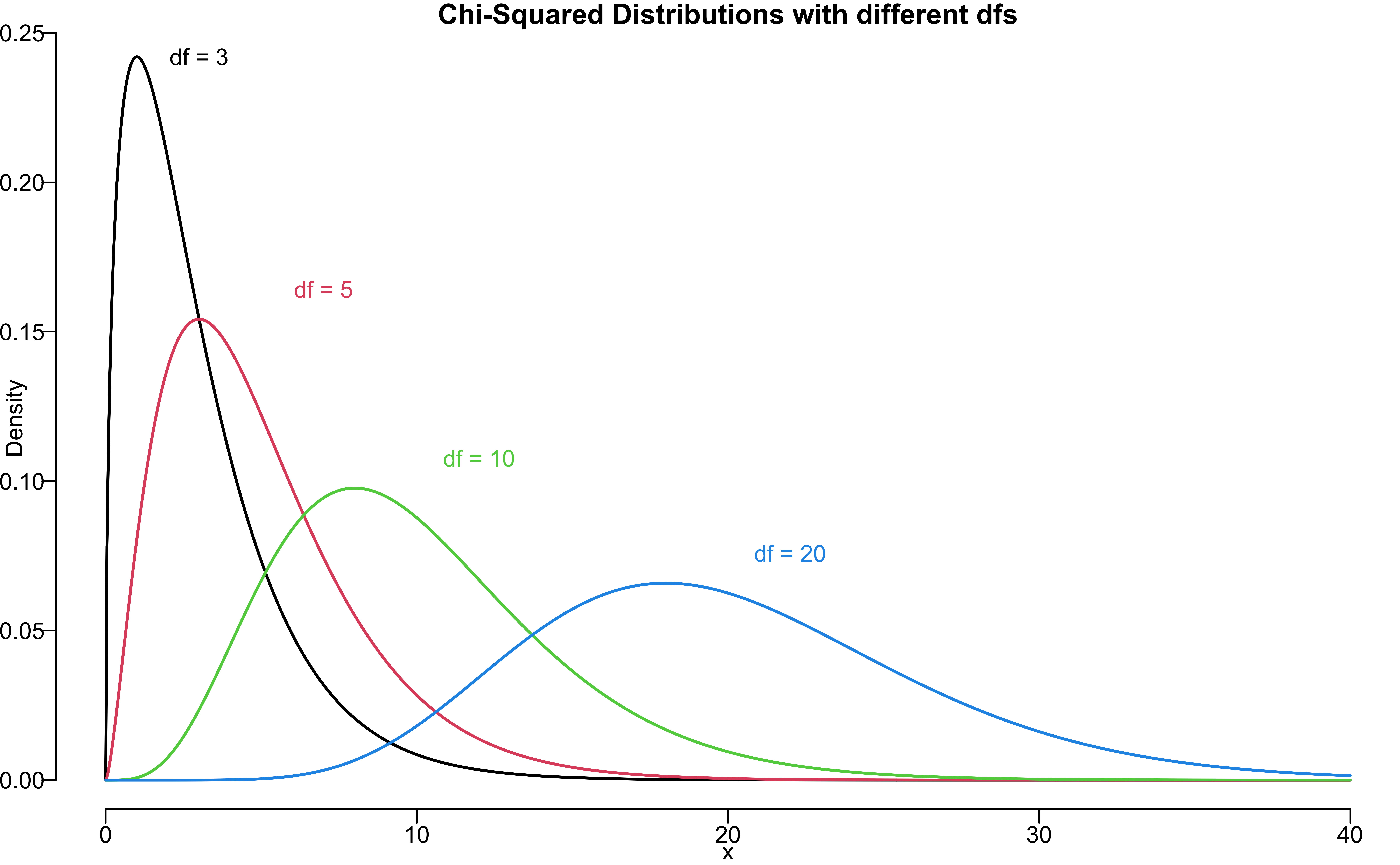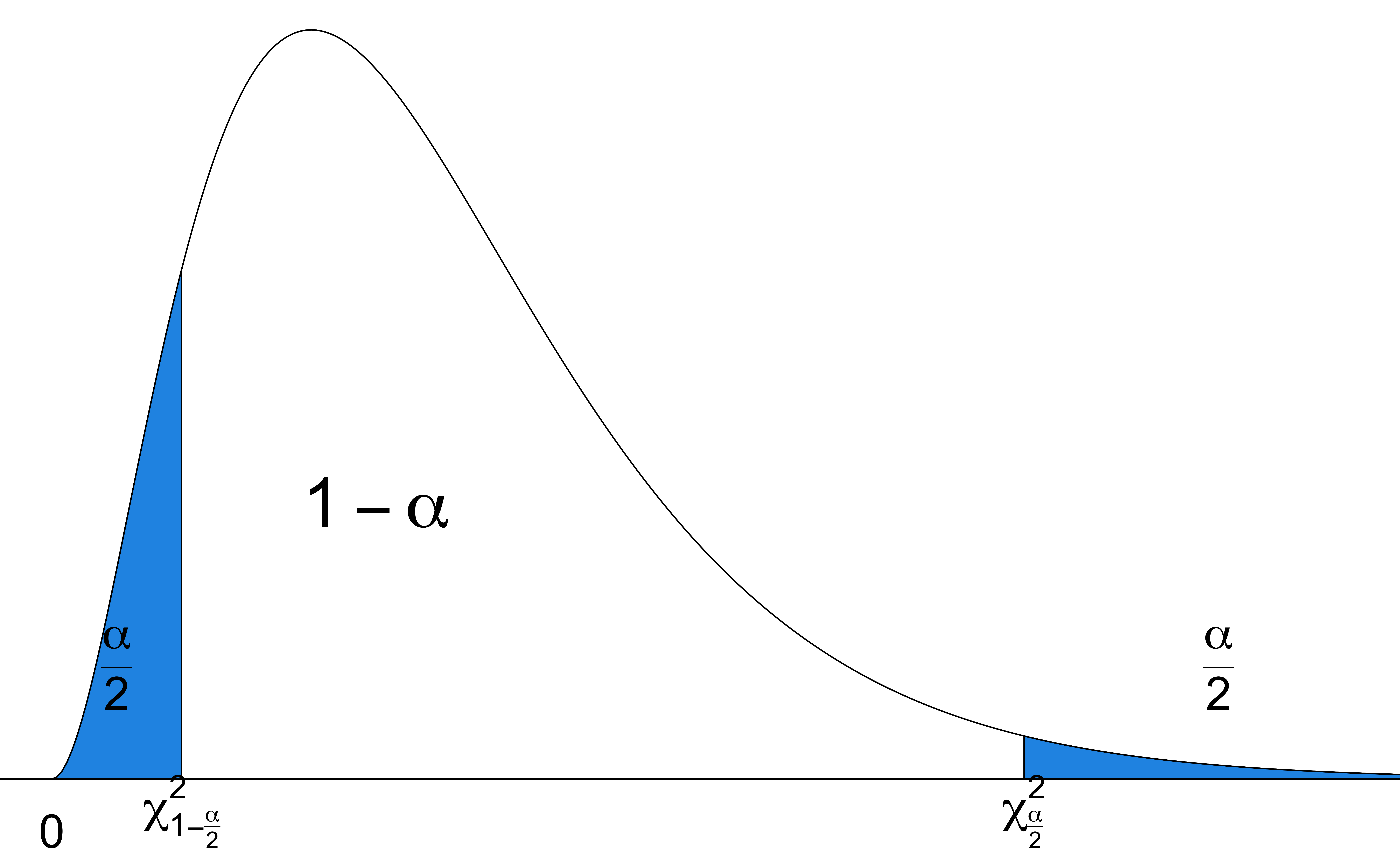 In \(N(0, 1)\), \(z_{1-\frac{\alpha}{2}} = -z_{\frac{\alpha}{2}}\). But \(\chi^2_{1-\frac{\alpha}{2},\,df} \ne -\chi^2_{\frac{\alpha}{2},\,df}\) because of non-symmetry of the \(\chi^2\) distribution.